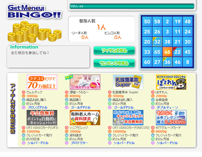 ゲットマネービンゴは、無料で遊べるビンゴゲームです。